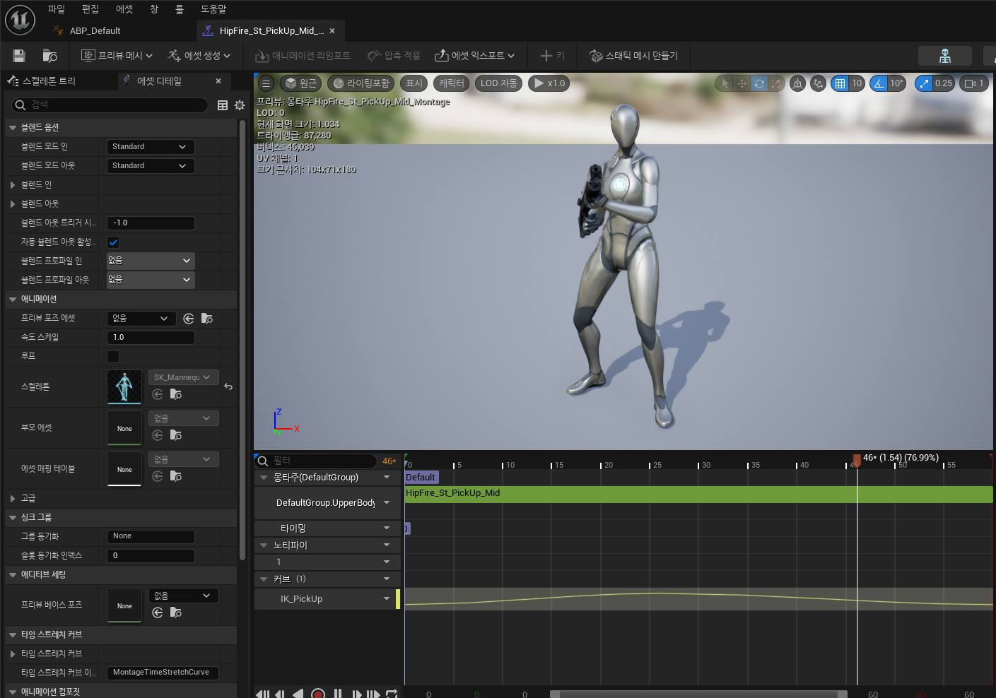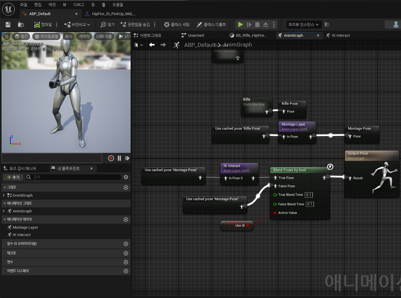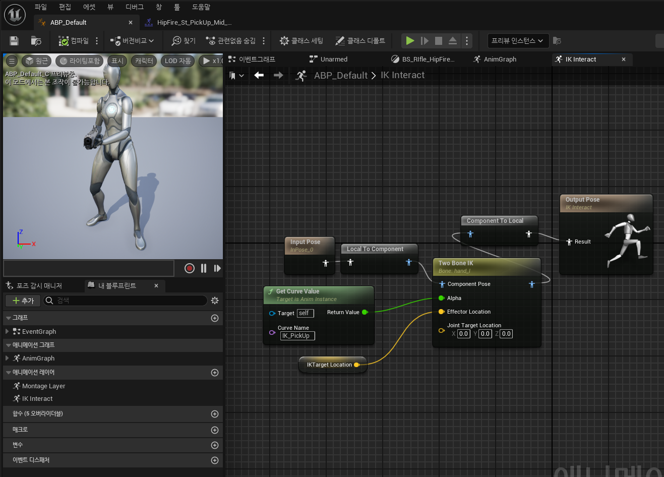 Pose를 받아와서, TwoBoneIK를 통해 몽타주의 지정된 커브의 Alpha값을 이용하여 IK의 Location을 보간하여 수정해준다.
