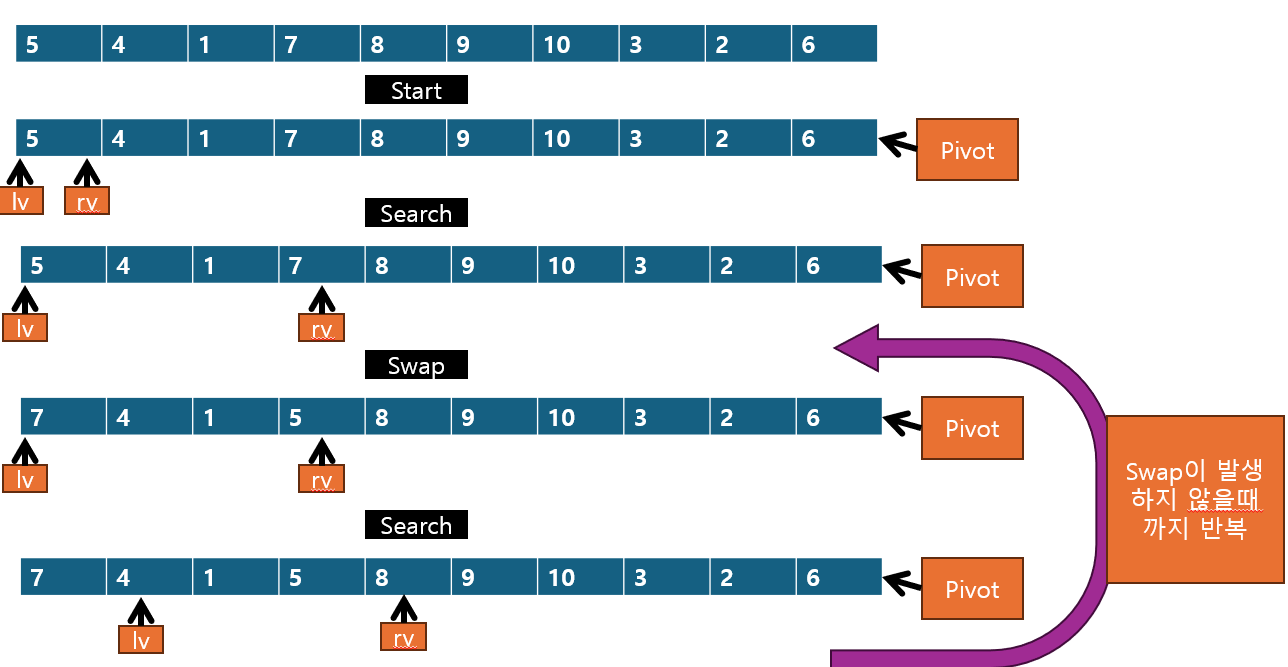 - 피벗을 기준으로 배열을 두 부분으로 분할한다. 피벗보다 작은 요소는 왼쪽에 큰 요소는 오른쪽에 배치되게 한다.
