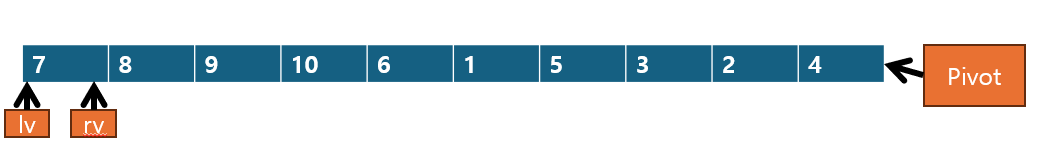 - 배열에서 피벗(pivot)을 선택한다.(피벗은 임의의 수를 이야기함)