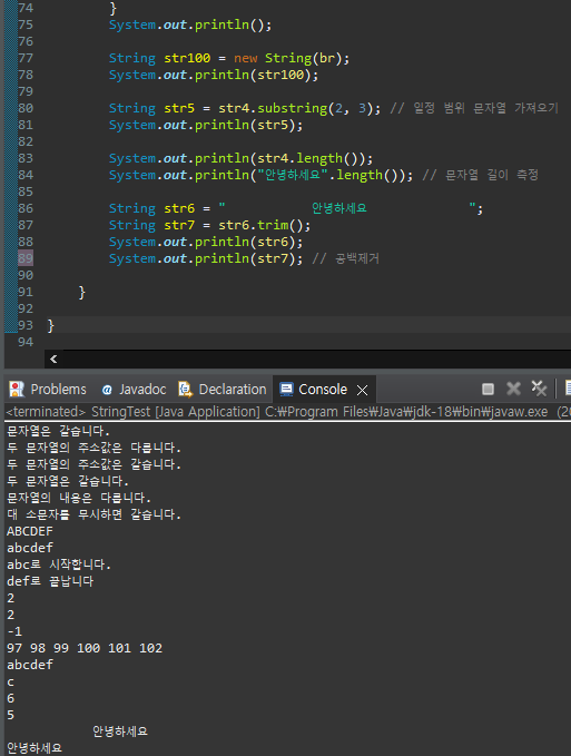 - 코드상에 " " 로 묶인 문자열도 String 클래스의 객체이다.