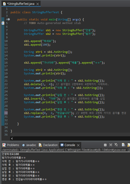 - .toString : StringBuffer클래스가 관리하는 문자열을 String 으로 반환