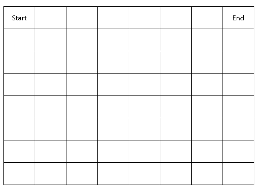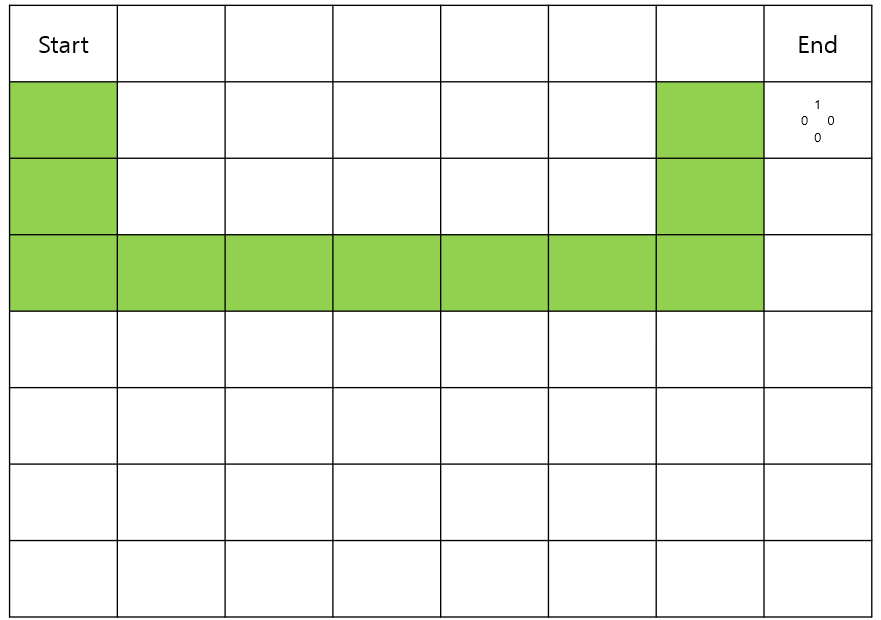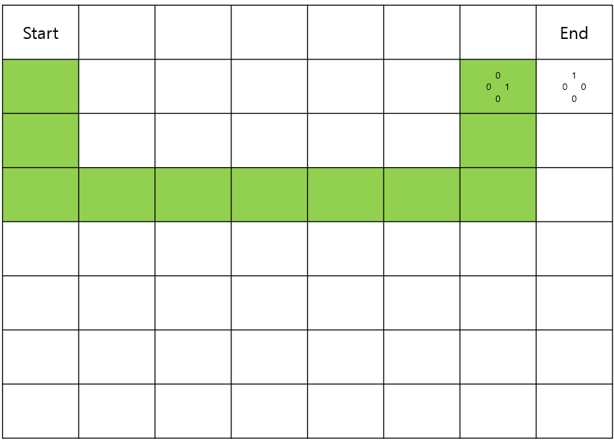 위 지도를 기준으로 Start가 End로 이동하는것 이 목표라고 가정하자. Start지점에서 End로 이동해야 성공한다.