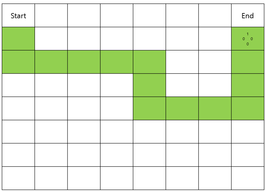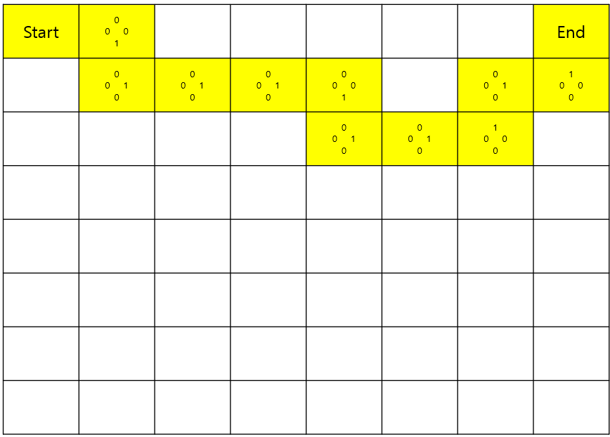 위와같이 이동에 성공하면, End의 바로 밑 단계에는 위로 이동하면 End가 존재한다고 방향에 1을 표기한다.