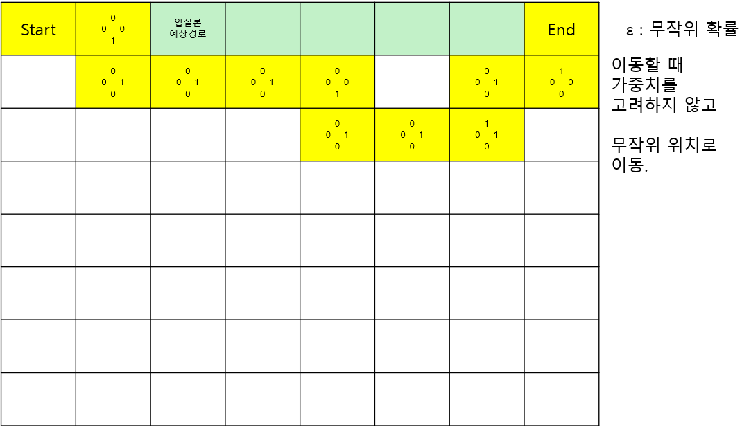 랜덤한 확률로 가중치에 해당되는 이동경로로 가지 않고 무작위로 선택된 이동경로로 이동하게 하는것 을 의미한다.
