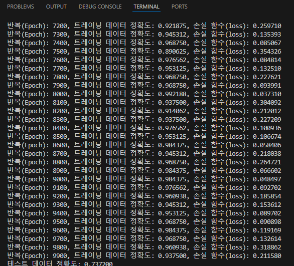 - print("테스트 데이터 정확도: %f" % test_accuracy): 최종 테스트 데이터 정확도를 출력한다.