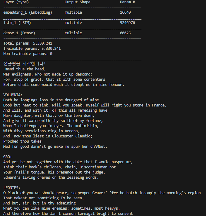 이 결과로 완벽하지는 않지만, 셰익스피어 어투의 문장이 생성되는 것이다.