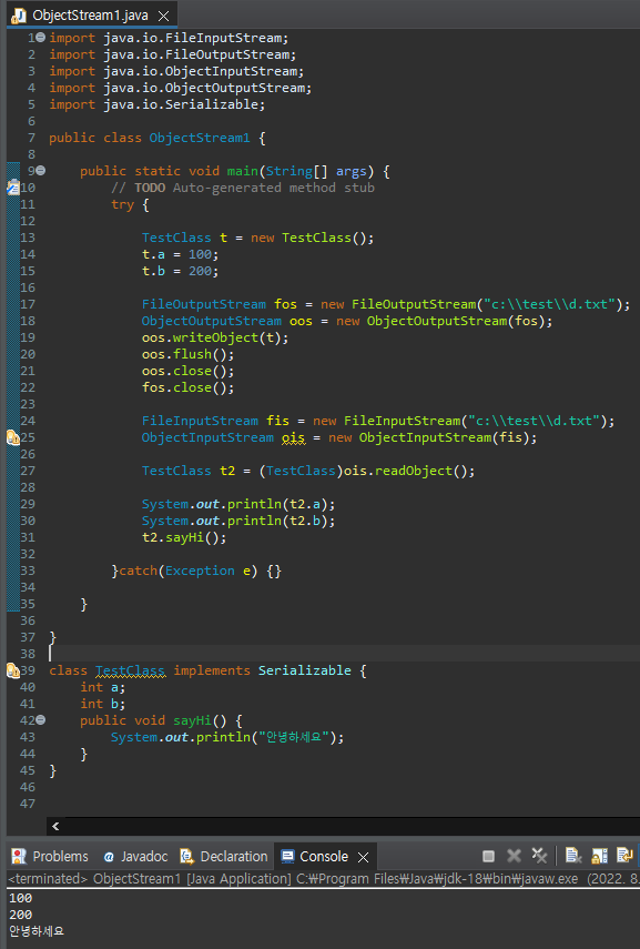 - 직렬화 하지 않은 객체를 스트림을 통해 입출력 할 수 없다.