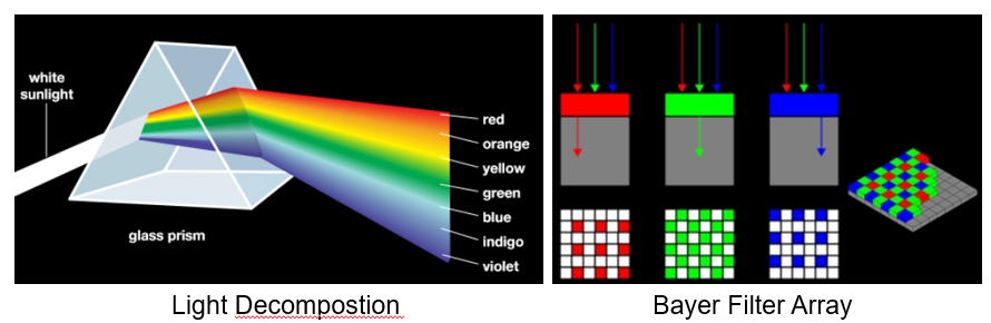 Bayer Filter Array 에 있는 필터는 들어오는 색상중 일정 색상만 걸러서 표시한다. Bayer Filter Array 필터에서 RGB 단위로 걸러서 표시한다. 필터 내부에 들어온 색상을 R은 빨강만 G 는 초록만 B는 파랑만 통과시킨다. 각 필터의 밝기를 0 에서 100까지 추산하여 밝기를 매핑하여 출력한다.