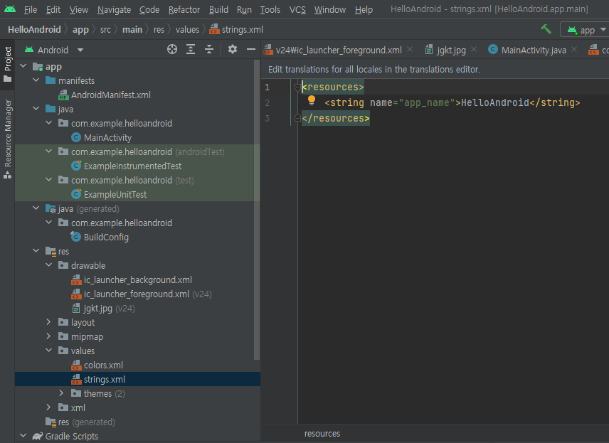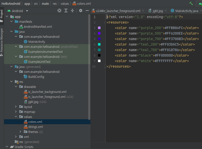 res = 리소스의 줄임말. 대부분의 이미지파일, 레이아웃 등 을 담는 폴더로 사용한다.