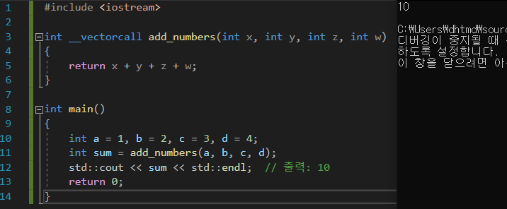 인자 전달 방법: 레지스터에 저장된다. 첫번째부터 세번째까지는 XMM레지스터에, 네번쨰부터 여덟번째 까지는 일반 레지스터에 저장된다.