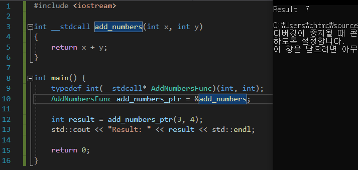 C++에서는 일반적인 함수포인터 선언방식 이외에 다른 함수포인터 선언방식을 지원한다. 사용방법은 다음과 같다. func라는 함수를 선언하였다. 11번째 줄은 함수 포인터 구조체를 사용하여 정의해주는 일반적인 방법이다. 구조체 내부에 함수포인터를 사용할 경우 대부분 이러한 방법을 이용하게 된다. 13번째 줄 또한 functype이라는 별명을 사용하여 함수포인터를 정의해주는 방법이다. 23번째 줄은 functional 라이브러리를 사용하여 함수 포인터를 선언하는 방법이다. functional 라이브러리를 사용하면 다양한 함수나 함수포인터를 객체로 간편하게 변환하거나 함수 객체를 조합하여 더 복잡한 동작을 수행하게 만들 수 있다.